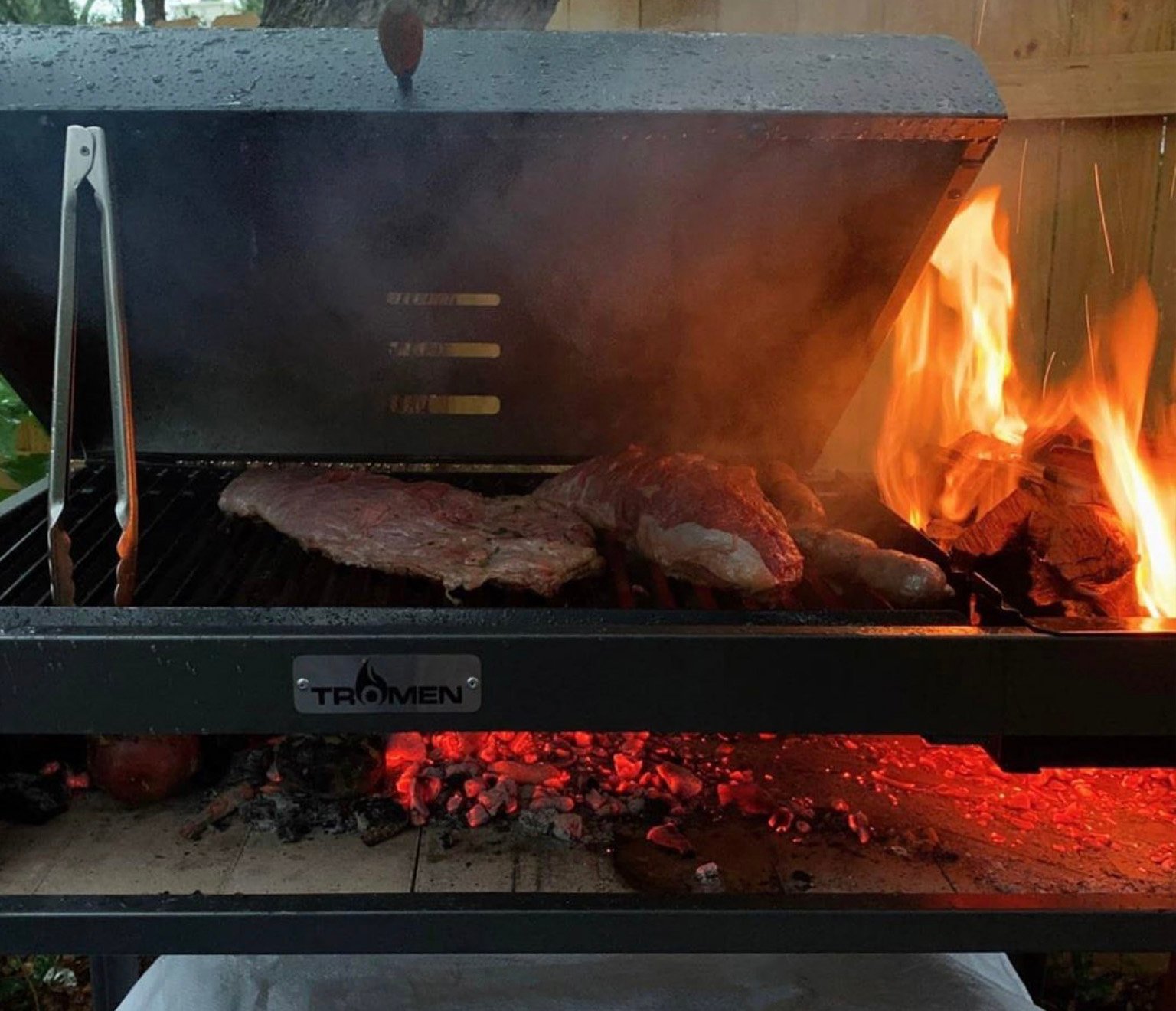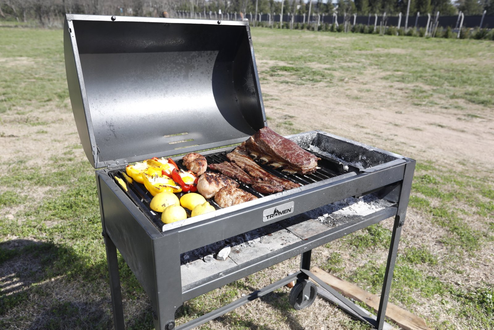 - Wood burning grill with a steel cover that helps you control the cooking temperature.